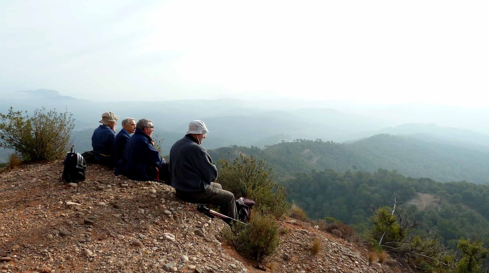 | Esmorzant al peu de la xemeneia de la Màquina de tren, amb la Morella al fons i la Mola, en mig de la boira |